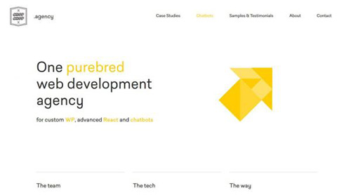 在UI元素中(如圖標(biāo)和導(dǎo)航元素等)使用多邊形元素也是最近比較流行的設(shè)計(jì)技巧。網(wǎng)頁(yè)設(shè)計(jì)中具體使用什么樣、多大的多邊形并沒(méi)有一套約定俗成的規(guī)則,這完全取決于設(shè)計(jì)師的創(chuàng)意和想法。不過(guò),就算是一個(gè)微小的多邊形都能讓某個(gè)圖標(biāo)或?qū)Ш讲藛雾?xiàng)更加突出。再加上不同色調(diào)的應(yīng)用,這種設(shè)計(jì)元素絕對(duì)能夠有效抓住用戶的注意力。Chop Chop Agency就是一個(gè)很好的栗子。它在網(wǎng)站中使用不同深淺的黃色拼接出了一個(gè)多邊形的箭頭,用來(lái)引導(dǎo)前往主導(dǎo)航菜單(當(dāng)然,拼接的多邊形并不凌亂)。在極簡(jiǎn)主義布局之下,這個(gè)多邊形的圖標(biāo)很是抓人眼球,在保持布局干凈的同時(shí)讓視覺(jué)焦點(diǎn)突出,有效地指引了訪客的瀏覽。除此以外,這個(gè)網(wǎng)站還有一個(gè)隱藏的設(shè)計(jì):多邊形的箭頭會(huì)隨著頁(yè)面的變化進(jìn)而轉(zhuǎn)化為其他形狀,給用戶提供截然不同的體驗(yàn),為枯燥的瀏覽過(guò)程增加趣味。